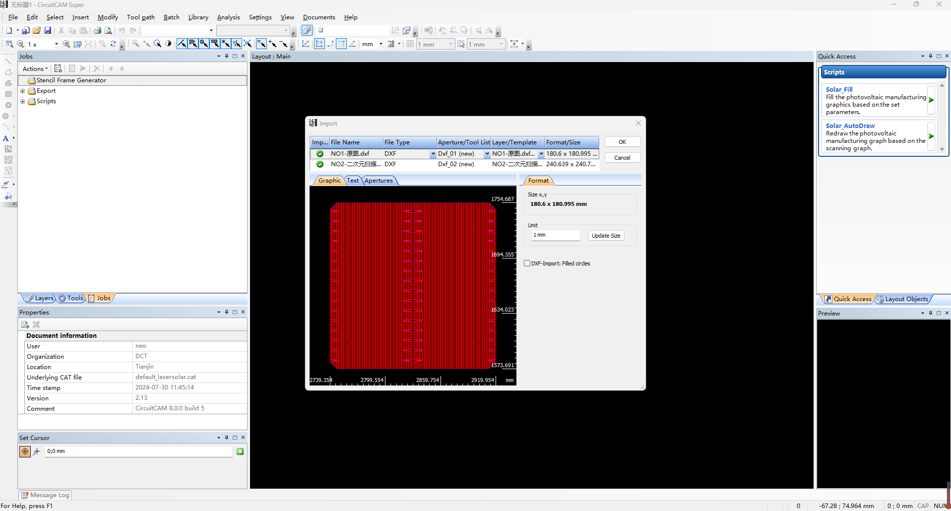 針對光伏行業的圖形處理需求,CircuitCAM8推出了LaserSolar模塊。這個模塊中,針對特定圖形的快速填充和計算、快速自動制圖等需求,推出了快速完成光伏圖形的填充計算的Solar_Fill功能;推出了以二次元掃描圖形為基準,一鍵自動繪制光伏圖形的Solar_AutoDraw功能。